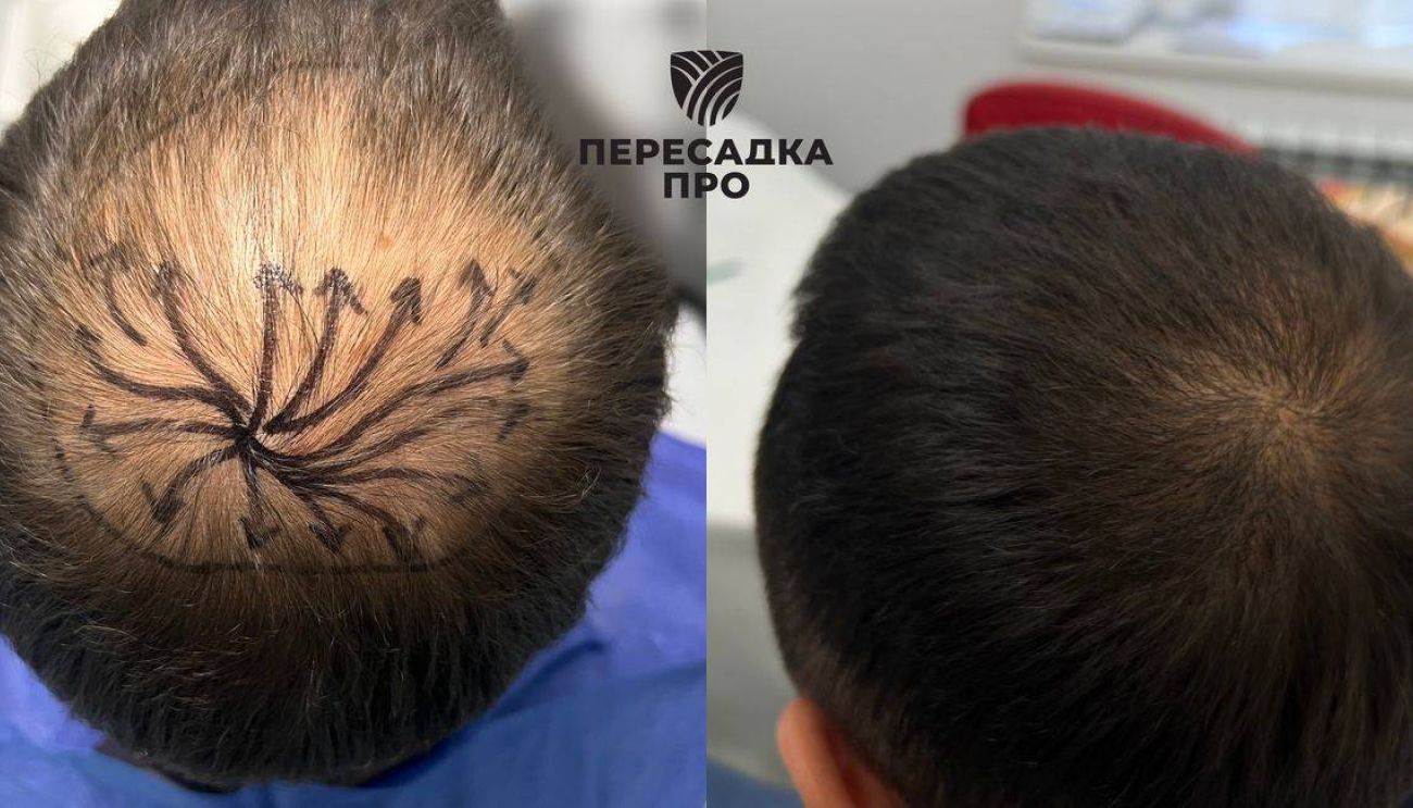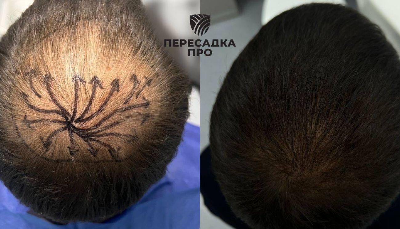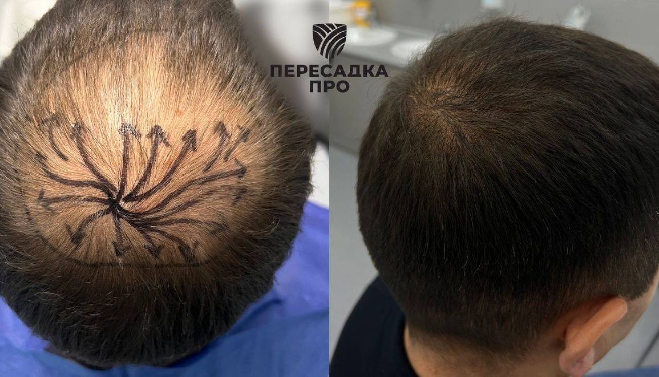 Пересажено 2000 графтов (метод пересадки волос — FUE), стадия облысения по Норвуду — 3. Результат через 6 месяцев. Послеоперационное восстановление: PRP‑терапия — 3 сеанса, консервативное лечение под контролем трихолога: миноксидил 5 %.